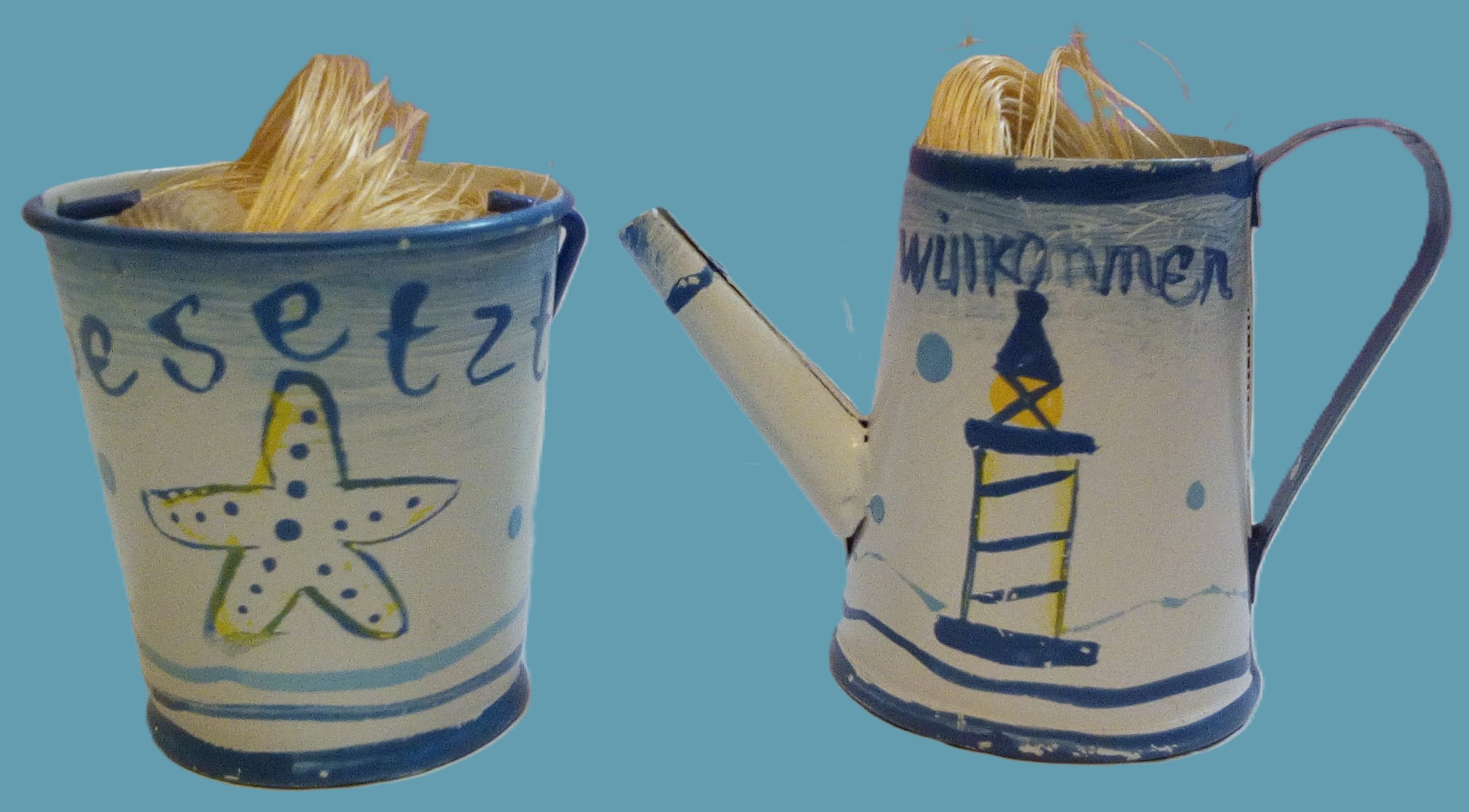 Μίνι σετ μεταλλικό χειροποίητο ποτιστηράκι-κουβαδάκι ζωγραφισμένα με καλοκαιρινές παραστάσεις και γεμισμένα με φυτικά στοιχεία. Επιτραπέζιο διακοσμητικό. Διαστάσεις: ποτιστήρι: ύψος 5cm, διάμετρος: 4cm/κουβάς: ύψος 4.5cm, διάμετρος 3cm.