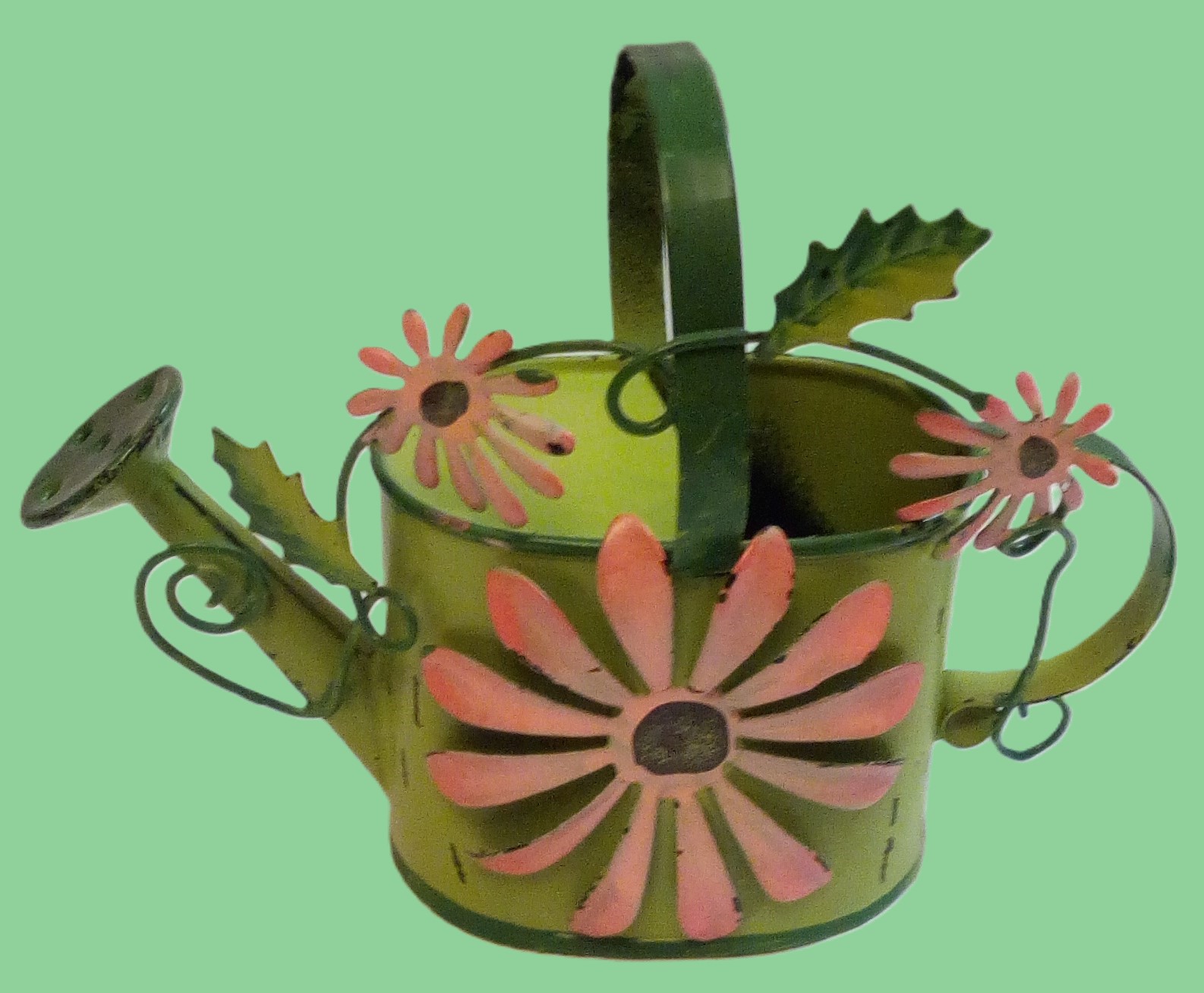 Πράσινο μεταλλικό χειροποίητο ποτιστήρι με διακόσμηση από μεταλλικό ροζ λουλούδι. Eπιτραπέζιο διακοσμητικό για εσωτερικούς κι εξωτερικούς χώρους. Διαστάσεις: ύψος 13cm x μήκος 11cm, βάση: μήκος 8cm x πλάτος 4cm.