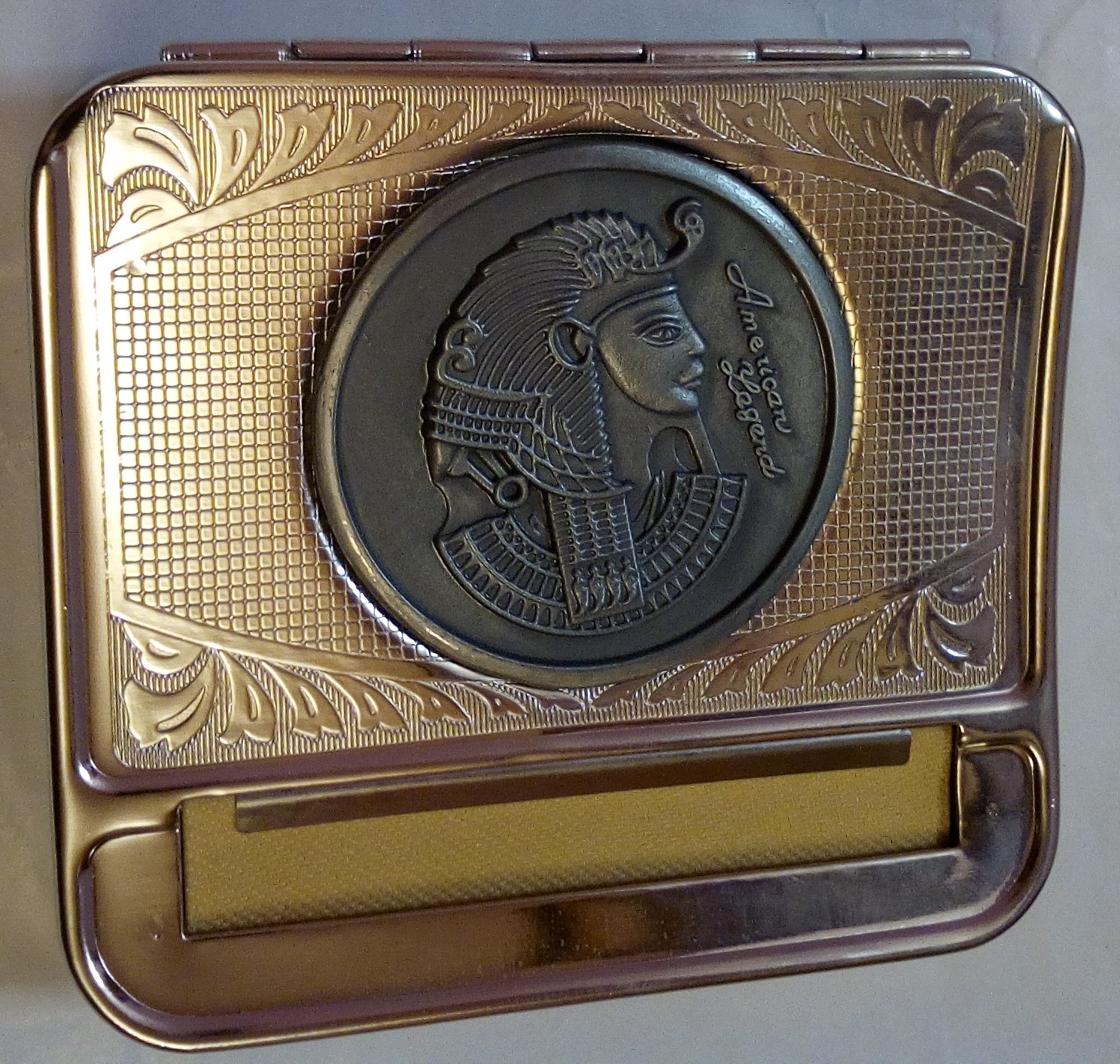 Μεταλλική ταμπακιέρα-στρίφτης με χαραγμένη φιγούρα Φαραώ- American Legend για το στρίψιμο ή/και την αποθήκευση των τσιγάρων σας. Διαστάσεις: ύψος 9cm x μήκος 8cm x πλάτος 2cm.