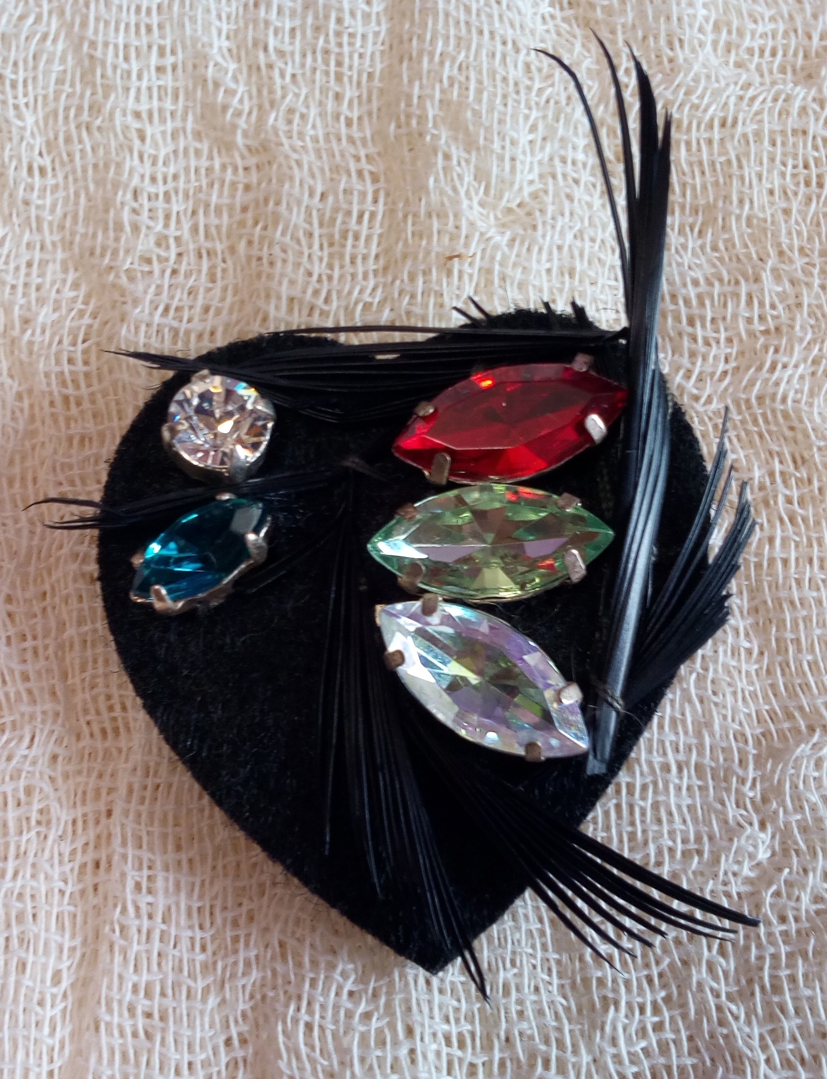 Black Fabric Heart-Feather Pin. Χειροποίητη καρφίτσα Cosa Nostra από υφασμάτινη βάση-καρδιά κεντημένη στο χέρι με συνθετικά φτερά, χάντρες και Swarovski. Διαστάσεις: 4cm x 3cm.