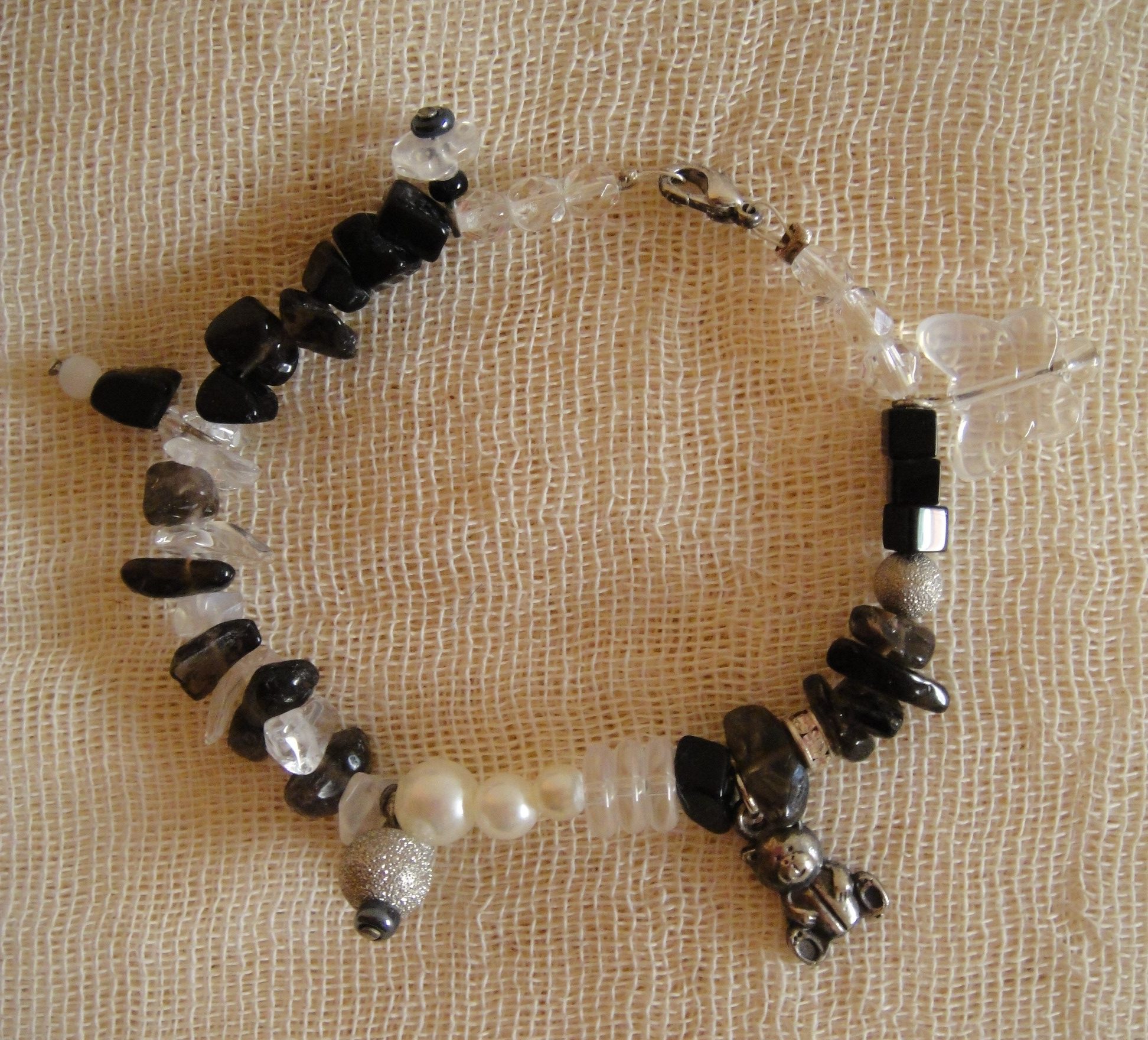 Cosa Νostra Ηandmade Βracelet – Black-White Semi-precious stones & Butterfly. Χειροποίητο βραχιόλι με σύρμα, τσιπς ημιπολύτιμων λίθων, νίκελ κούμπωμα, μεταλλικά στοιχεία (αρκουδάκι), στρας, συνθετική πέρλα, χάντρες (μεταλλικές, απλές). Μήκος ≈22cm.
