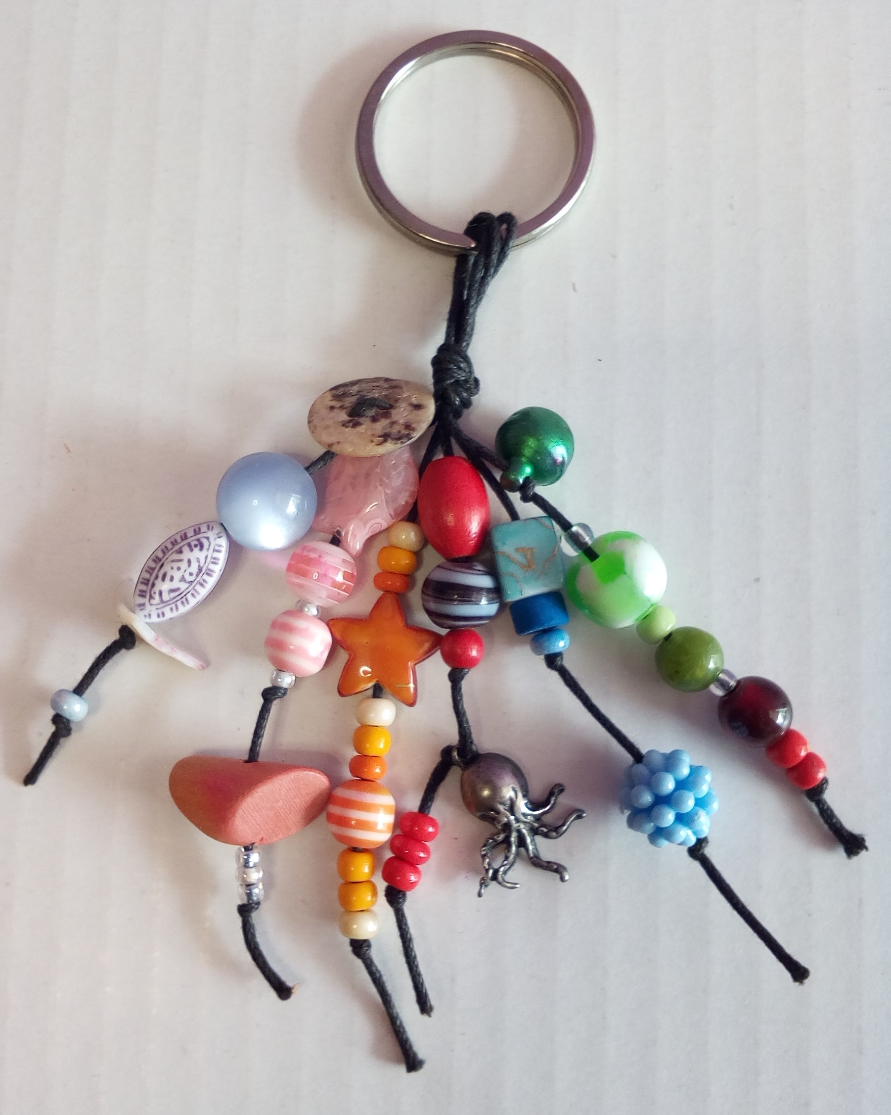 Cosa Nostra Handmade Key Ring – Octopus. Χειροποίητο μπρελόκ από μαύρο κορδόνι σε rainbow συνδυασμό από χάντρες (γυάλινες, ξύλινες, κεραμικές, απλές), μεταλλικό στοιχείο-οχταπόδι και κουδουνάκι, κεραμικά στοιχεία (ψαράκι, αστέρι), κουμπί φίλντισι, όστρακο. Mήκος 3cm, διάμετρος κρίκου, συνολικό 12cm.