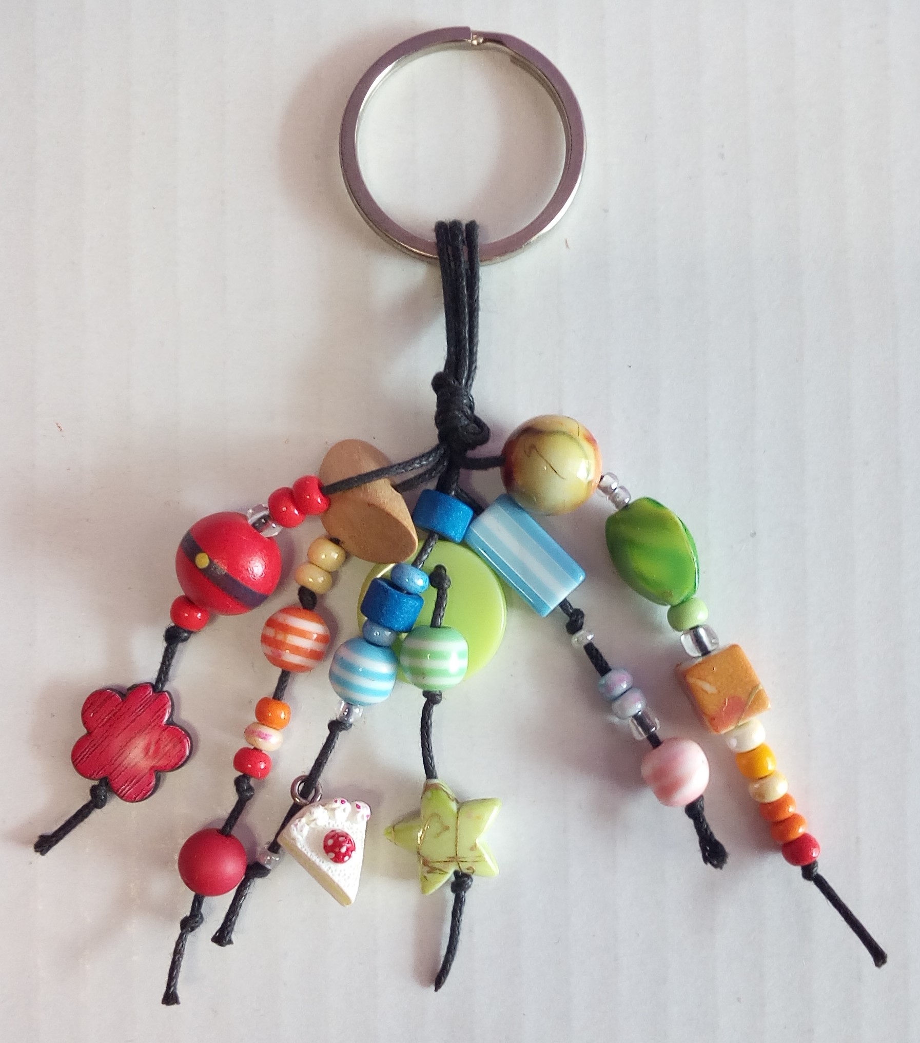 Cosa Nostra Handmade Key Ring – Piece of Cake. Χειροποίητο μπρελόκ από μαύρο κορδόνι σε rainbow συνδυασμό από χάντρες (γυάλινες, ξύλινες, κεραμικές, απλές), πράσινο κεραμικό αστέρι, στοιχείο από συνθετικό υλικό-κομμάτι κέικ. Mήκος 3cm, διάμετρος κρίκου, συνολικό 13cm.