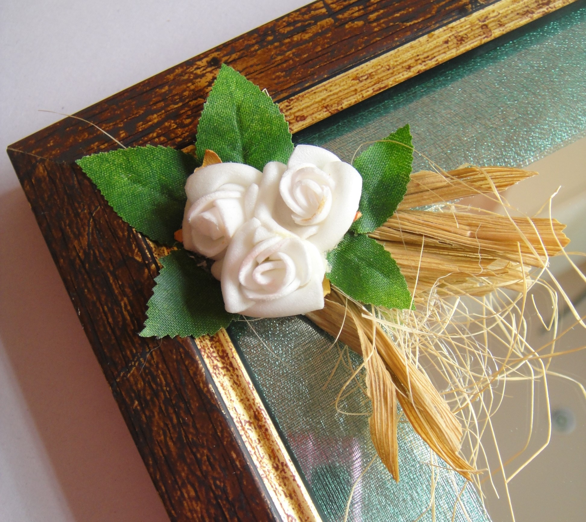 Cosa Nostra Handmade Mirror Rectangle Brown Frame – White Roses & Flower Pot