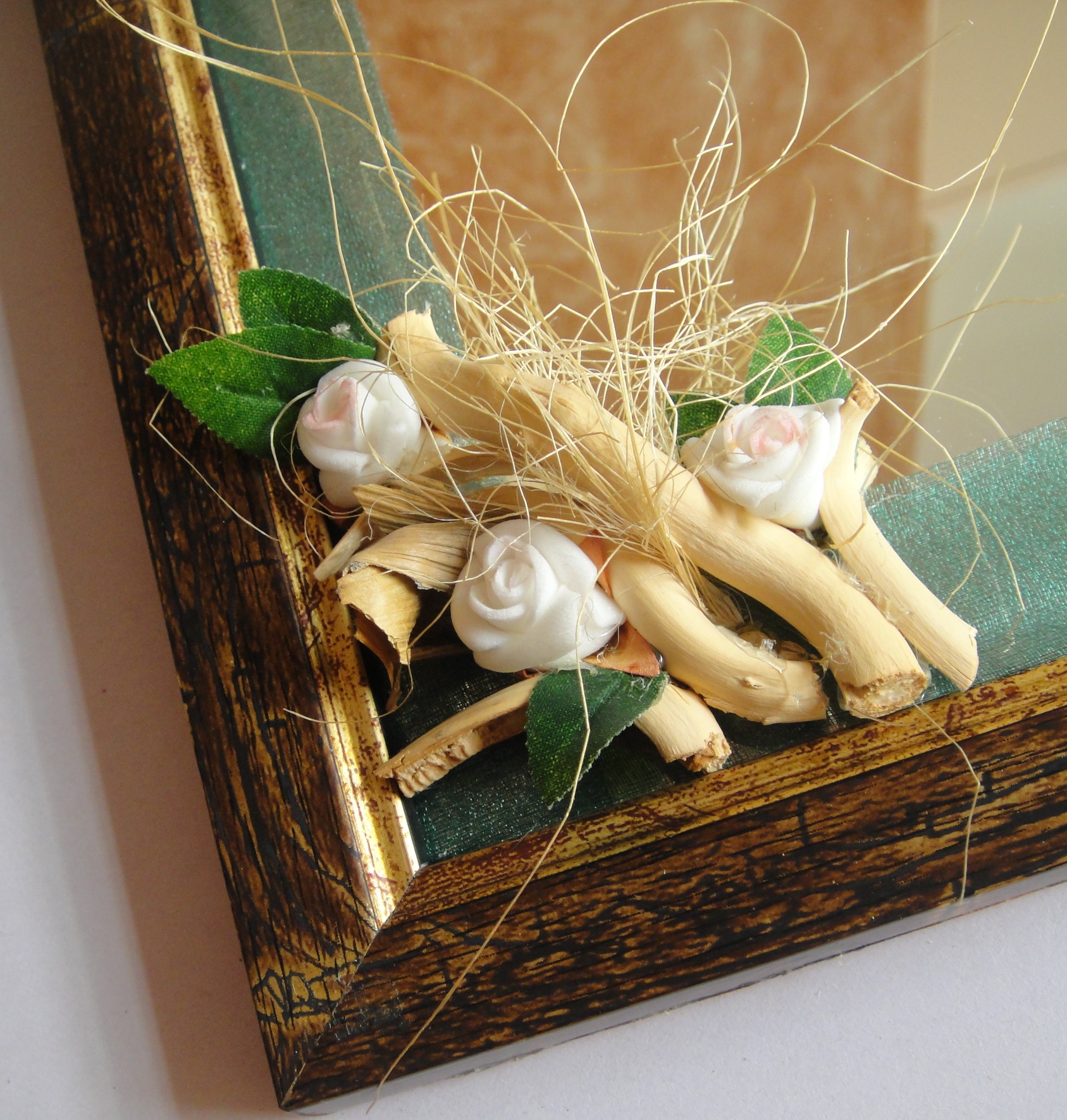 Cosa Nostra Handmade Mirror Rectangle Brown Frame- White Roses & Flower Pot – Ορθογώνιος καθρέφτης Cosa Nostra με καφέ ξύλινη κορνίζα με χρυσή μπορντούρα και χειροποίητη διακόσμηση από πράσινη οργάντζα, υφασμάτινα λευκά ρόδα, φυτικά στοιχεία, καλάμι, πήλινη γλάστρα μοντελισμού. Διαστάσεις: 41cm x 25cm.