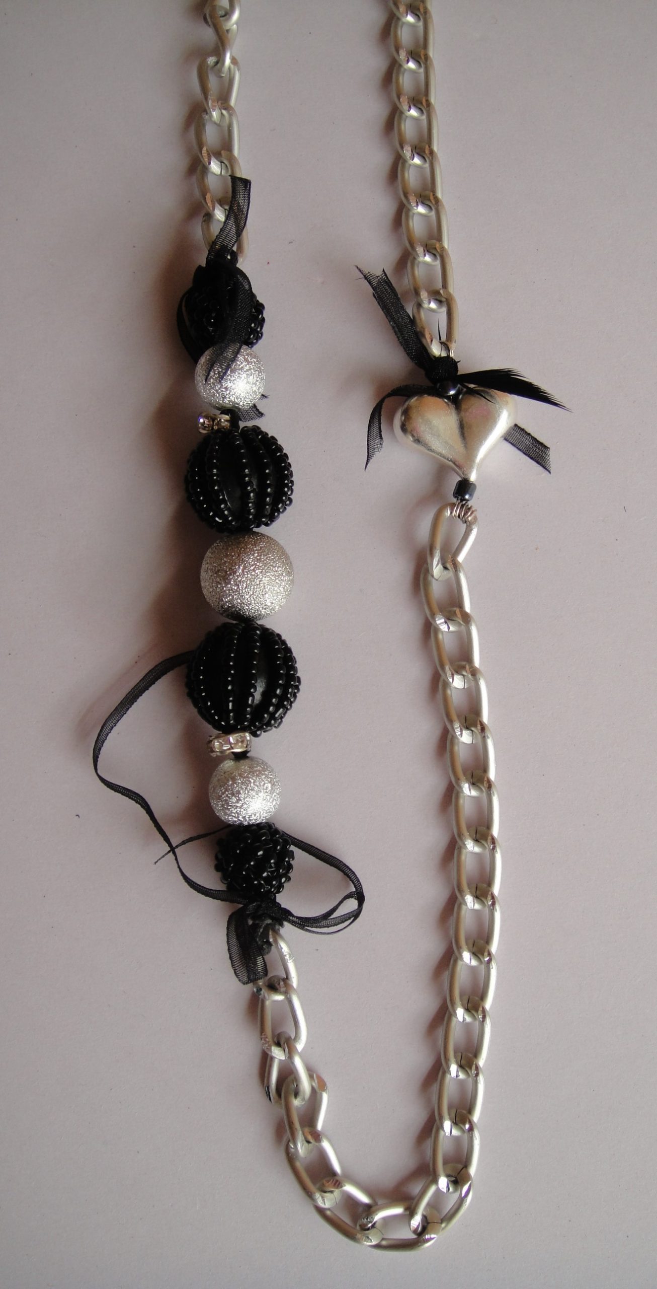 Cosa Nostra Handmade Necklace – Black Silver Chain XL. Χειροποίητο κολιέ διακοσμημένο στο χέρι με χάντρες (χειροποίητες, μεταλλικές, απλές), σύρμα, μεταλλικά στοιχεία (καρδιά), στρας, οργάντζα σε επάργυρη αλυσίδα. Μάκρος 44cm.