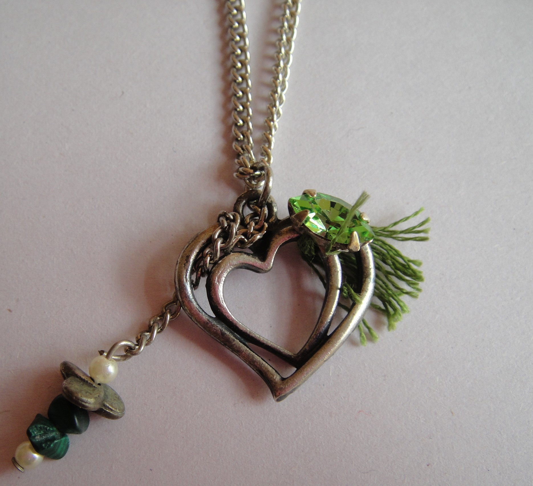 Cosa Nostra Handmade Necklace – Green Metal Heart. Χειροποίητο κολιέ με μεταλλικό στοιχείο (καρδιά) κεντημένο στο χέρι με τσιπ ημιπολύτιμου λίθου, Swarovski, νήμα και χάντρες σε νίκελ αλυσίδα κι επάργυρο κούμπωμα. Μάκρος 25cm.