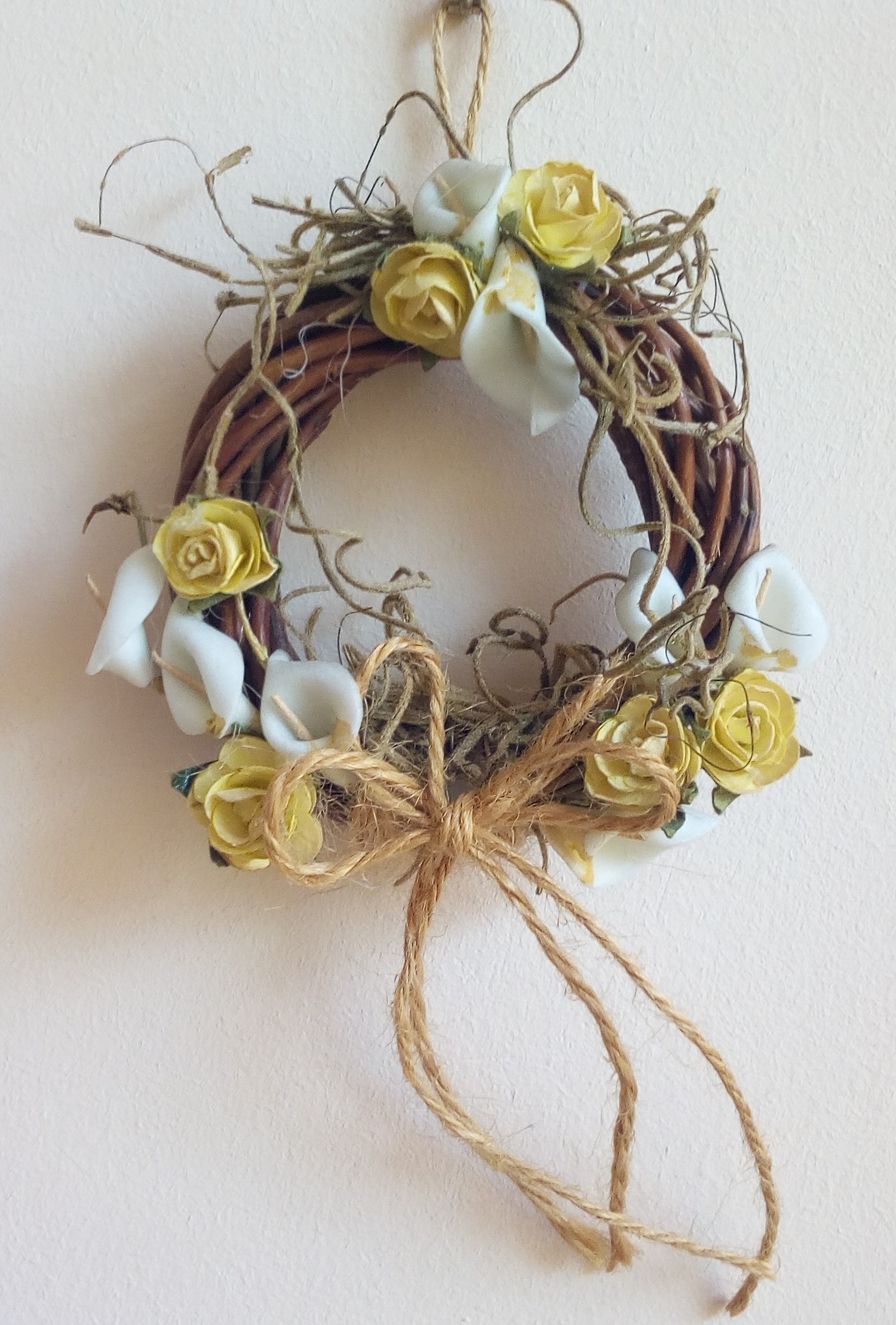 Μίνι στεφάνι κλαδιών με χειροποίητη διακόσμηση από υφασμάτινα κίτρινα τριαντάφυλλα και λευκούς κρίνους, φυτικά στοιχεία και σπάγγο. Διάμετρος: στεφανιού 5cm + 2cm κορδόνι.