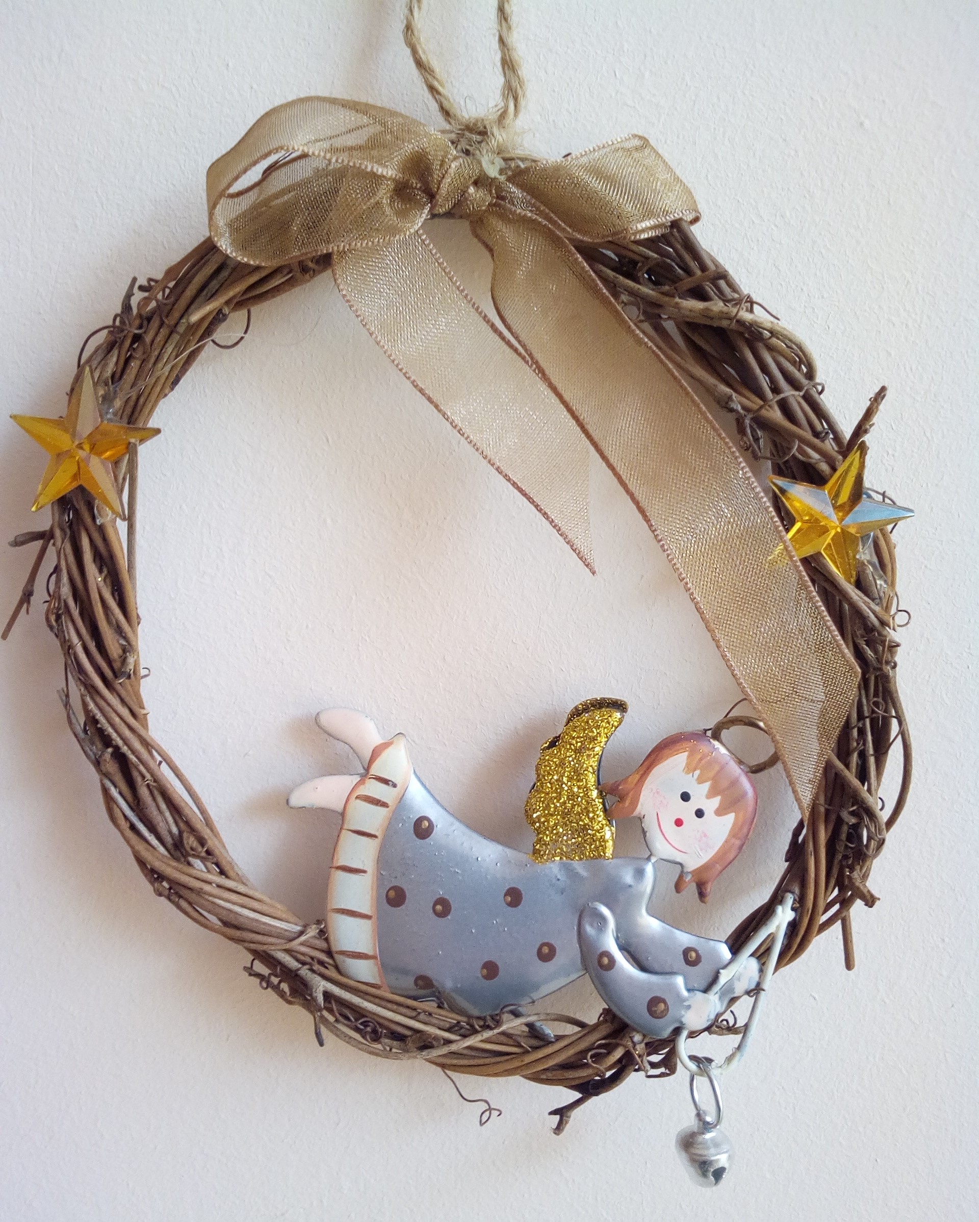 Xmas Wreath – Angel with harp & bell. Χειροποίητο στεφάνι από κλαδιά με χειροποίητη μεταλλική φιγούρα άγγελου σε χρώματα γκρίζο-καφέ-χρυσό, κορδέλα-οργάντζα και σκήπτρο με άρπα-κουδουνάκι. Διάμετρος 12cm + κορδόνι 10cm.